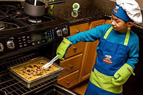 - INCLUDED IN THE SET: This vibrant and fun set includes a child-sized apron, right and left oven mitts, and a chef's hat, all made with 100% cotton. With its adjustable straps and lively colors, your little ones will feel like real chefs in the kitchen. The machine-washable fabric ensures easy cleanup after cooking adventures. Dimensions of the set are 16.75" x 12" x 2", perfect for ages 4 and up.