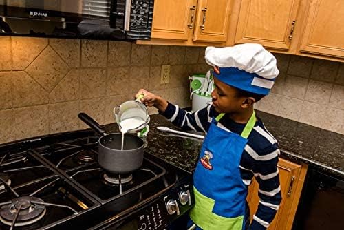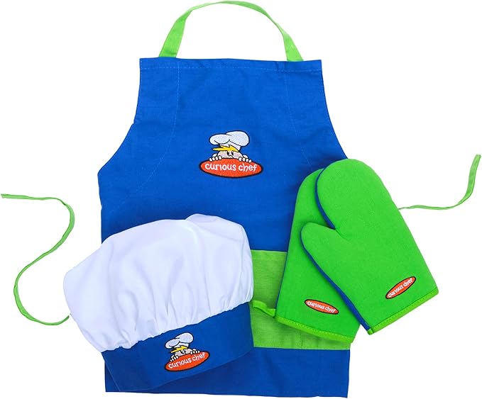Curious Chef 4-Piece Child Textile Set for Kids and Toddlers, Blue and Green Child-Sized Apron, Oven Mitts and Chef’s Hat, Real Kitchen Wear Cooking Kit