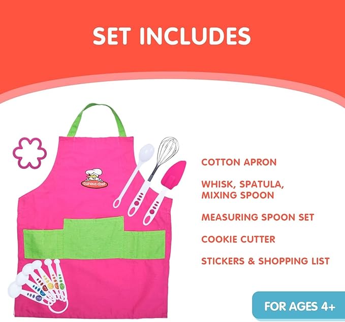 - INCLUDED IN THE SET: This collection includes a vibrant pink and green 100% cotton and machine washable apron with adjustable straps, ensuring a perfect fit for ages 4 and up (22.75" L x 19.5" W). The set also has stainless steel whisk, a 6-piece measuring spoon set, a large silicone spatula, a poly spoon, and a flower shaped cookie cutter, made from heat-safe silicone up to 450°F.