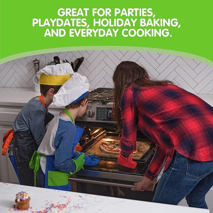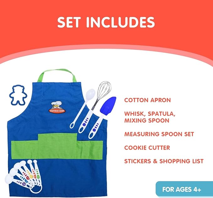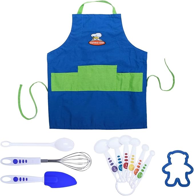 - INCLUDED IN THE SET: This collection includes a vibrant blue and green 100% cotton and machine washable apron with adjustable straps, ensuring a perfect fit for ages 4 and up (22.75" L x 19.5" W). The set also has stainless steel whisk, a 6-piece measuring spoon set, a large silicone spatula, a poly spoon, and a star shaped cookie cutter with dimensions of 12" L x 3.5" W x 12" H, made from heat-safe silicone up to 450°F.
