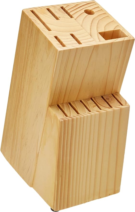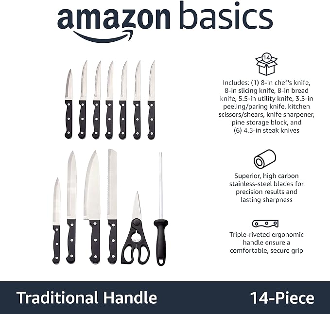 Amazon Basics 14-Piece Kitchen Knife Set with High-Carbon Stainless-Steel Blades and Pine Wood Block, Black
