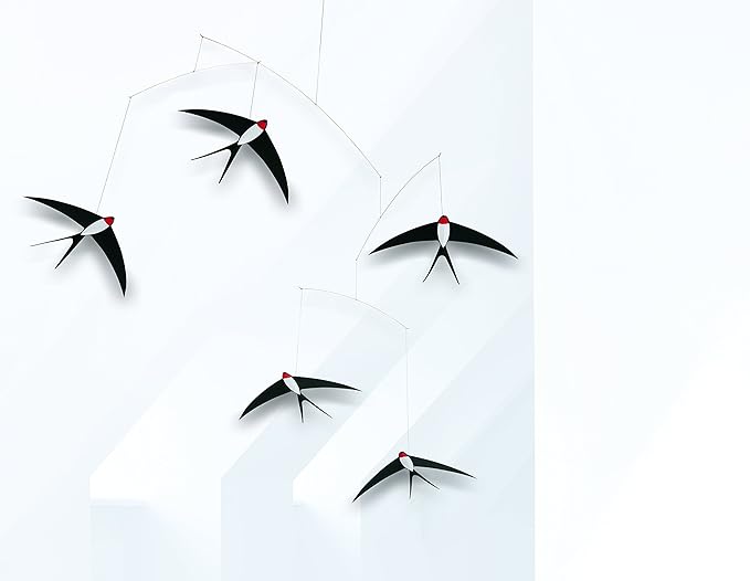 - Hang this mobile over your bed or sofa to recall the elegant flight and clever aerobatics of the swallow. Our beloved swallows have nested in the garden over the summer, so now the mobile is also available with 5 swallows. Still available with three swallows (FM-24).