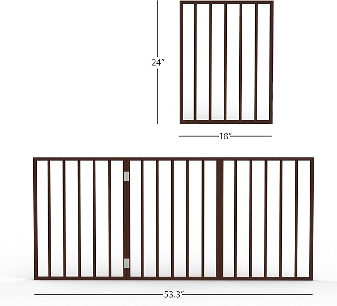 - PRODUCT DETAILS - Materials: Wood and Metal. Dimensions: (L) 53.3" x (W) 1" x (H) 24"; Folded: (L) 18" x (W) 3" x (H) 24". Recommended for Openings Measuring 33”-46” Wide. Door Gates for Pets Only. Color: Brown.
