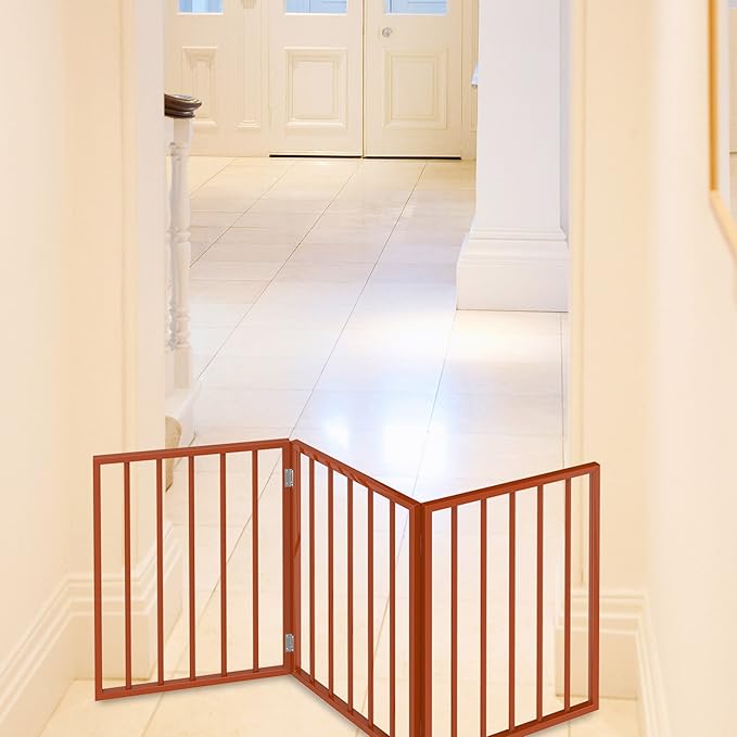 Pet Gate - 3-Panel Indoor Foldable Dog Fence for Stairs or Doorways - 54x24-Inch Retractable Wood Freestanding Dog Gates by PETMAKER (Mahogany)