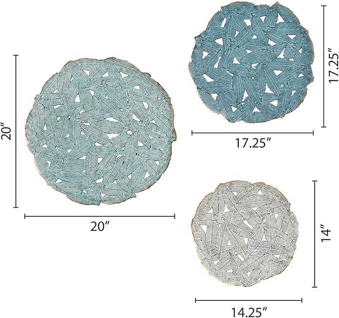 - Painted with a beautiful blue hued iron finish, this wall decor set offers a splash of color to any room.