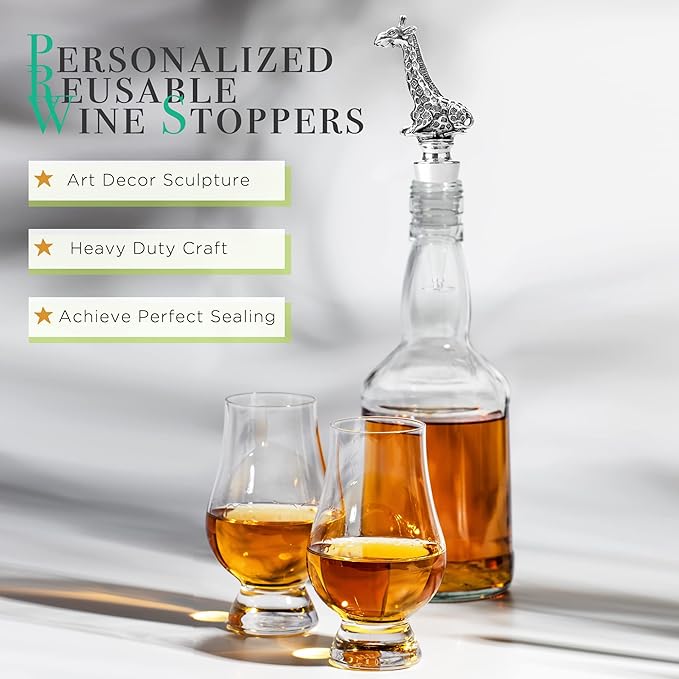 - PERSONALIZED REUSABLE WINE STOPPERS: The 4.7" wine bottle stopper features characterized top - finely cast 3D giraffe sculpture which texture is clearly visible. Only this gorgeous wine stoppers for wine bottles worthy of the ritual of savoring fine old wines, these funny wine accessories with aesthetic could elevate the ambience for your nightly sip.