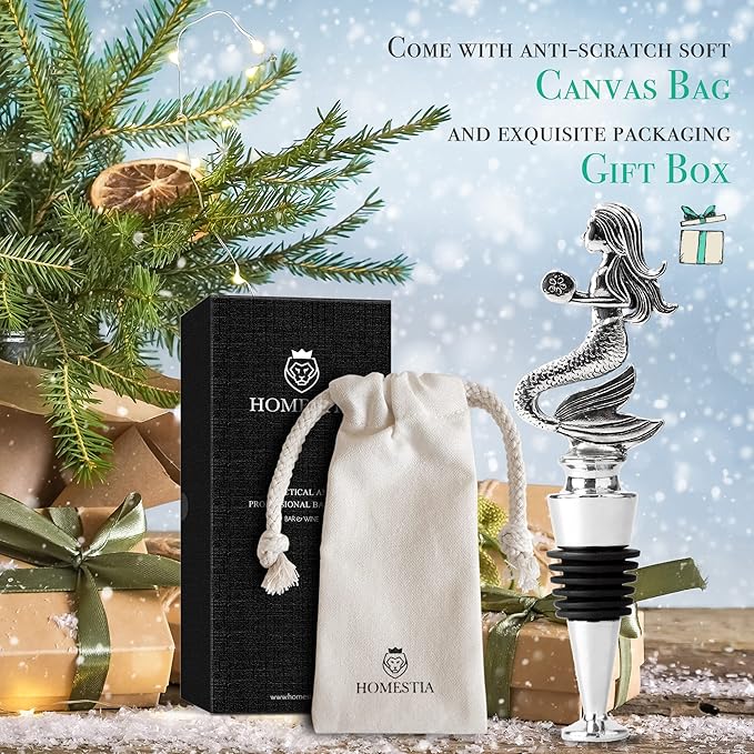 Homestia Wine Bottle Stoppers for Glass Bottles, Mermaid Bottle Stopper Reusable Wine Corks Wine Tool, Zinc-Alloy Silicone Wine Stoppers, Wine Toppers with Decors