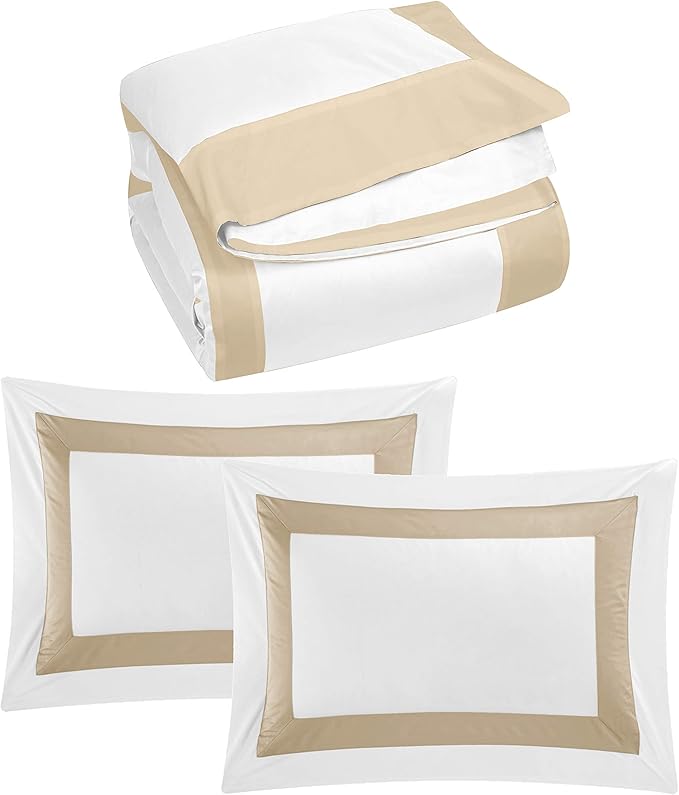 Bicolore Collection Duvet Covers Set 3 Pieces Do Not Include Filling ClassIC European 100% Egyptian Cotton Sateen Luxury 400 Thread Count Frame Patchwork Manufacturing(White/Beige,Queen)