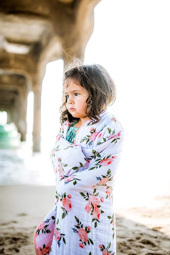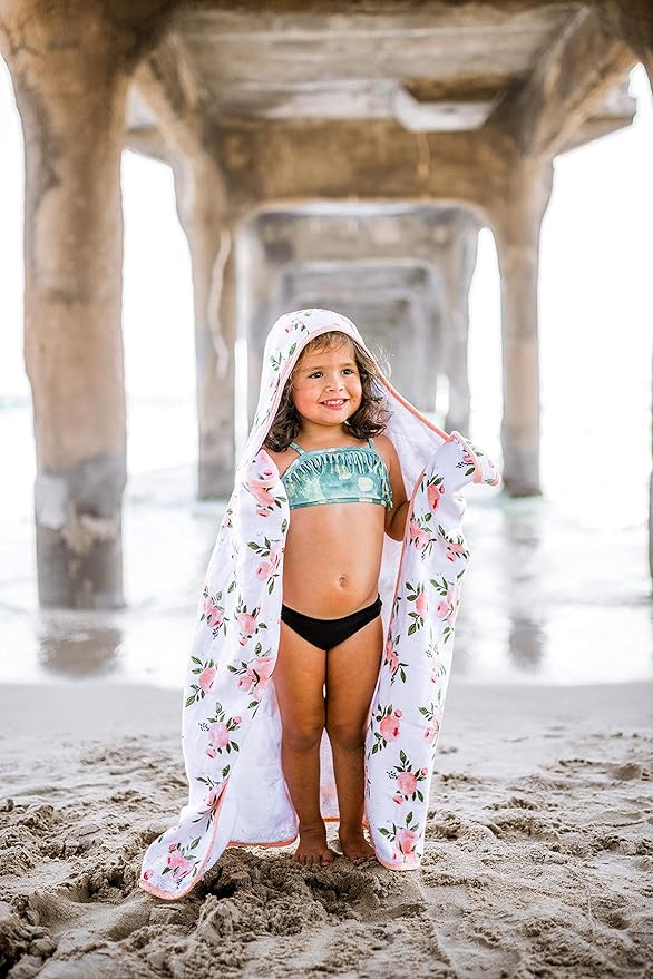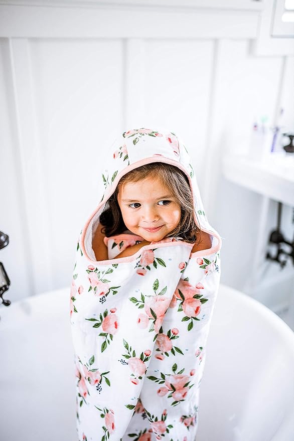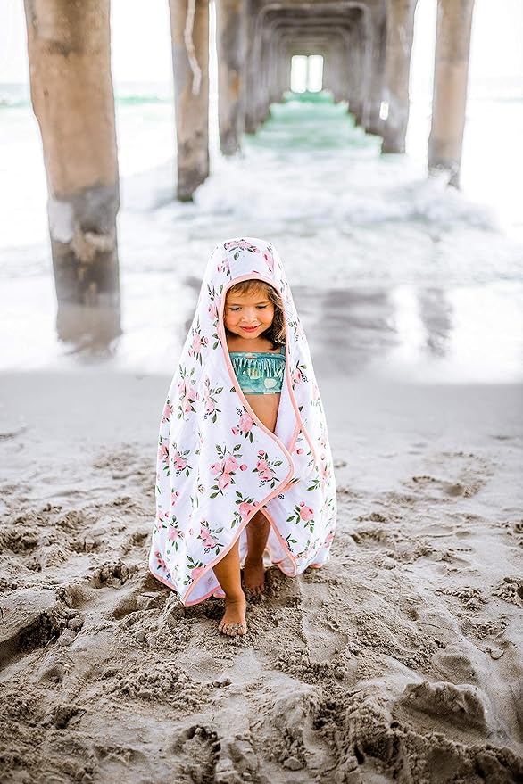 Little Unicorn Cotton Muslin & Terry Hooded Towel, Larger Size 1-6 Years (Watercolor Roses)
