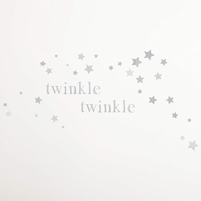 - ADORABLE SOPHISTICATED, CLASSIC THEME: You will think that you are in living on a cloud with our adorable sophisticated, classic look. The fitted sheet features a simple grey trellis pattern set off by a tiered, ruched bed skirt. The quilt features soft, billowy cascading ruffles. The large nursery wall decal depicts silvery stars and the words TWINKLE TWINKLE, completing your sophisticated, classic nursery look.
