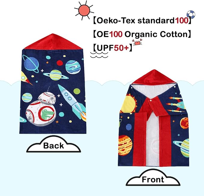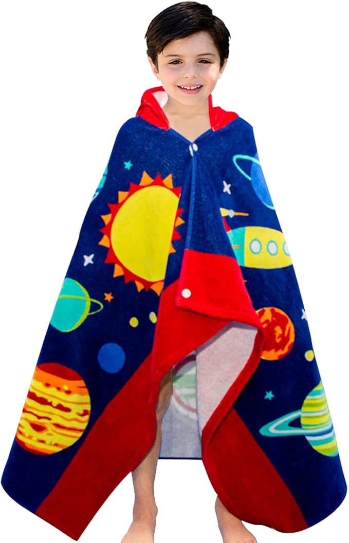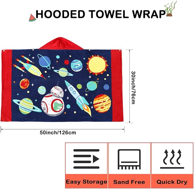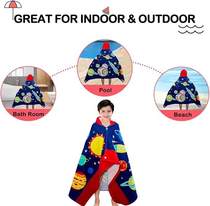 - 【Multi-purpose & Size】The hooded towel has an unfolded size of "30 x 50"inch, which is the perfect bath towel for children. In the summer, whether you're taking your kids to the beach, swimming in the pool, or camping, this poncho towel wrap is fine for use in all of these indoor and outdoor locations.