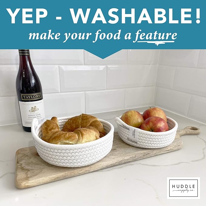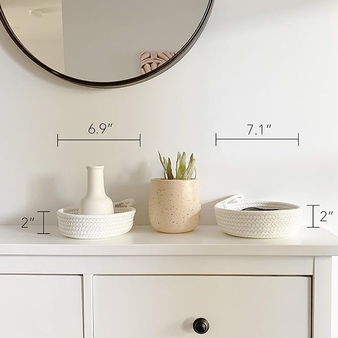 Small Basket Set - 2PC WASHABLE Small Storage Basket 100% Cotton Small Rope Basket 7.5" Small Woven Basket for Key Basket, Mini Basket, Kitchen Basket, Remote Basket (White, Small)