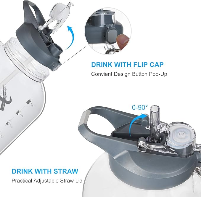 - Functional Design with 2 in 1 Lid: With this 1 gallon water bottle, you can sip from a straw or chug as much water as you want by switching over it freely without replacing the lid. Silicone straw allows you enjoy spill-proof sipping without efforts and the chug opening is designed innovatively with a smooth pour for fast water flow when you’re feeling the burn. Also 4’’ wide mouth opening accommodates ice cubes and refill water easily, also is easy for cleaning with a bottle brush.