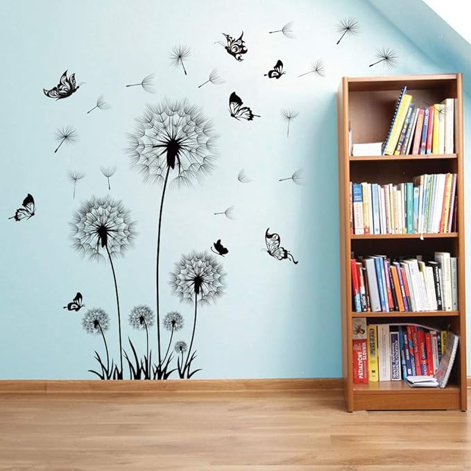 Runtoo Black Dandelion Wall Decals Flower Butterfly Wall Stickers for Living Room Bedroom Home Decoration Wall Décor