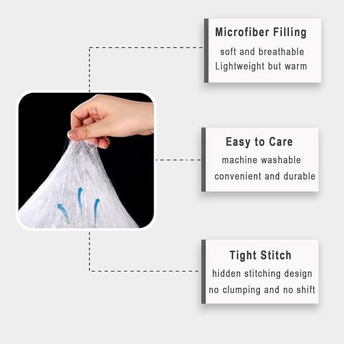 - Premium Filling : Whole piece microfiber filling with tight stylish stitching prevents fill from clumping or shifting;The comforter is fluffy and lightweight ; It will not put downward pressure on your body ;This soft and breathable fabric is good for a comfortable night’s sleep