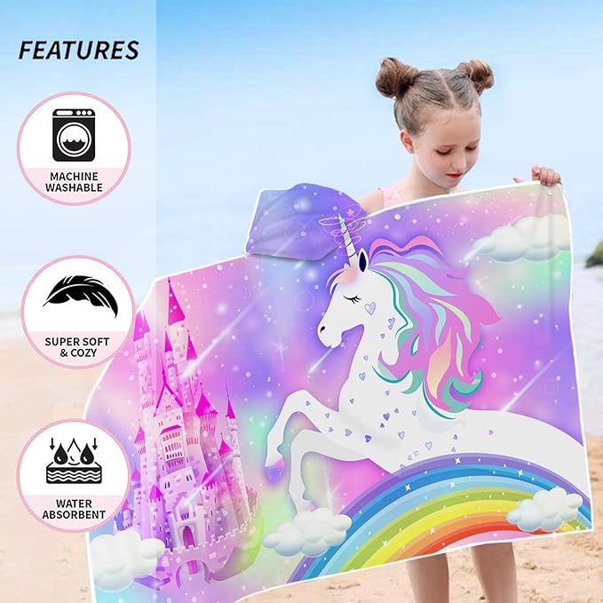Unicorn Hooded Beach Towel for Kids, Cute Rainbow Bath Towel with Hood for Girls, Pink Magic Castle Microfiber Super Absorbent Soft Poncho Bathrobe for Swin Pool 30”x50”