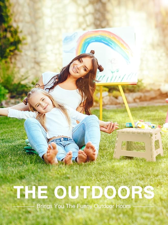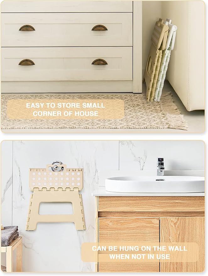 - [Fold Up & Opens Easy] - Ergonomic carrying handle is designed for easy folding and carrying. Just lift the handle, it could be quickly and easily folded away for storage. The handle of child step stool magically appears when the stool is folded flat, allowing you to take it around so you can place it where you need it.