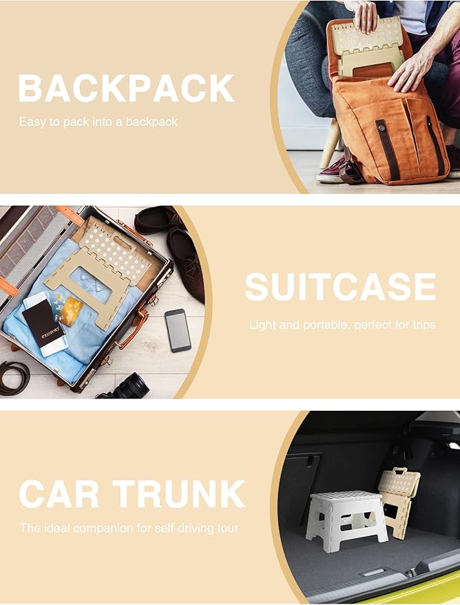 - [Anti Slip Rubber Base] - Special rubber dots on the kitchen step stool surface and anti-slip black rubber strap on each foot for maximum foot grip and gives amazing comfort, preventing slippage. Unique and grip-dot textured surface make the portable step stool safe for everyone. Ideal for Kids, Children and Adults.