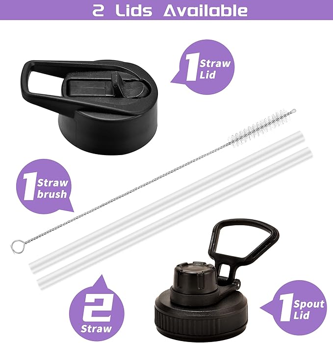 - 【2 Lid Availabl】It comes with 2 compatible and leakproof lids to fit your every need. One spout lid with screw cap allows for fast water flow when you're feeling the burn. Another straw lid allows you to enjoy spill-proof sipping without efforts. They allow easy one-handed or hands-free drinking even when you're busy. Perfect for any indoor and outdoor activities.
