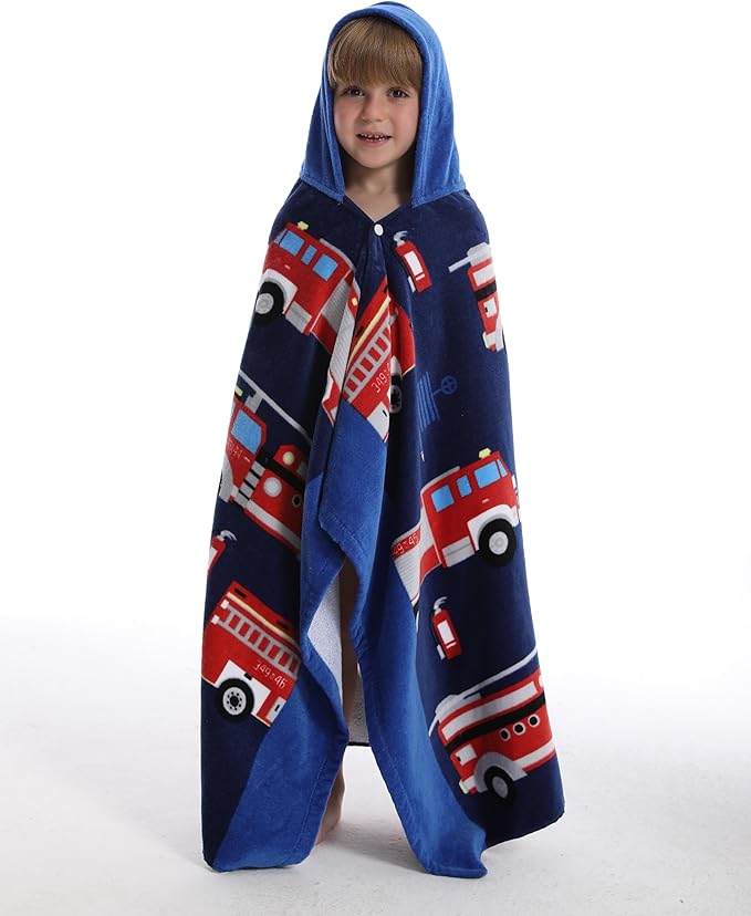 BANGSAUR Kids Hooded Beach Towels, 100% Cotton 50x30 inches Bath Pool Towel Wrap, Toddlers Boys 3-12 Years Coverup Fire Truck