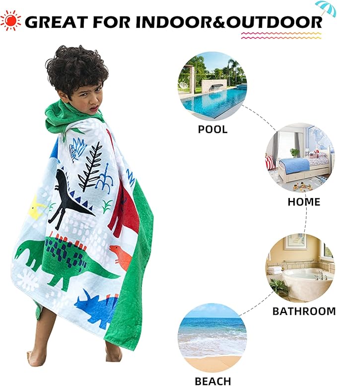 - Fun Cartoon Design: The colorful cartoon elements of the kids' bath towel, such as Dolphin, Dinosaur, Ocean Fish and Ship, Cool Fire Fighting, all are so cute! And with the hood, Warm or Sun-Protection. Snaps design makes the kids cotton bath towel not easy to drop and prevent children from catching a cold