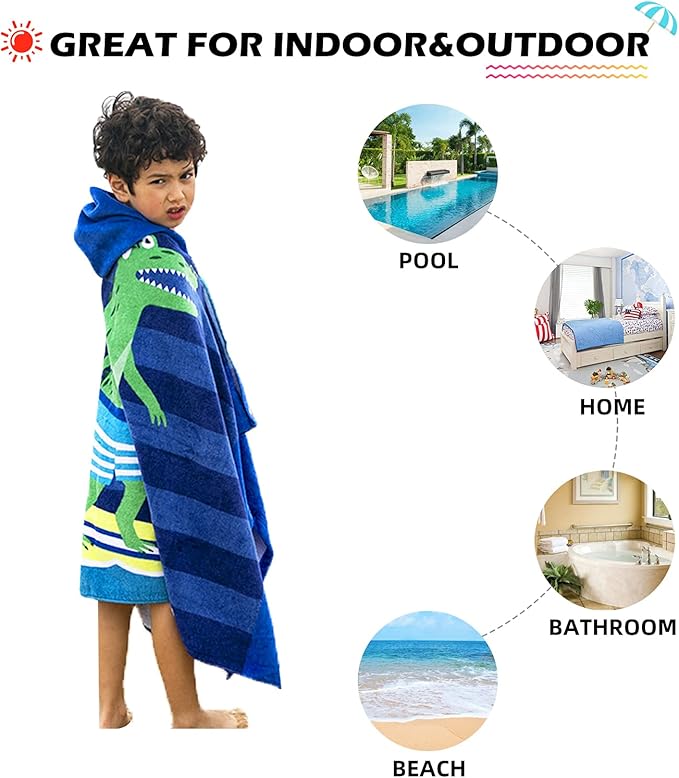 - Fun Cartoon Design: The colorful cartoon elements of the kids' bath towel, such as Dolphin, Dinosaur, Ocean Fish and Ship, Cool Fire Fighting, all are so cute! And with the hood, Warm or Sun-Protection. Snaps design makes the kids cotton bath towel not easy to drop and prevent children from catching a cold