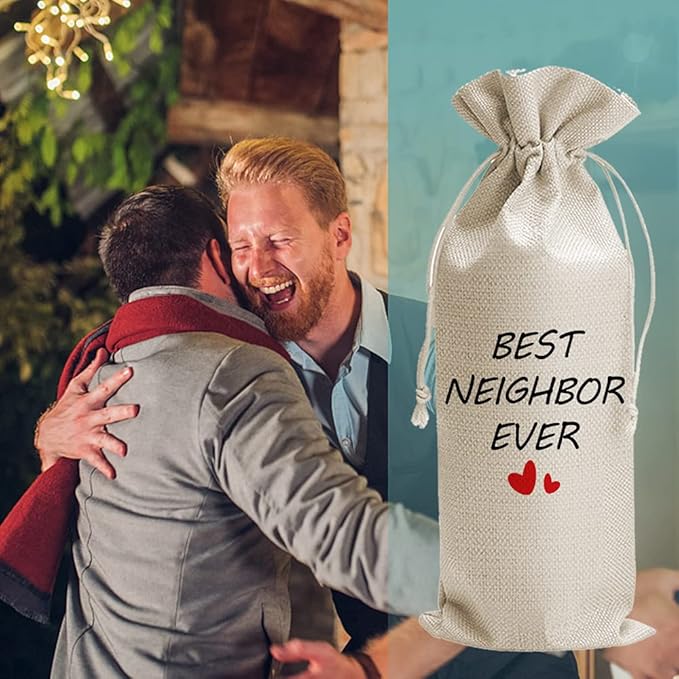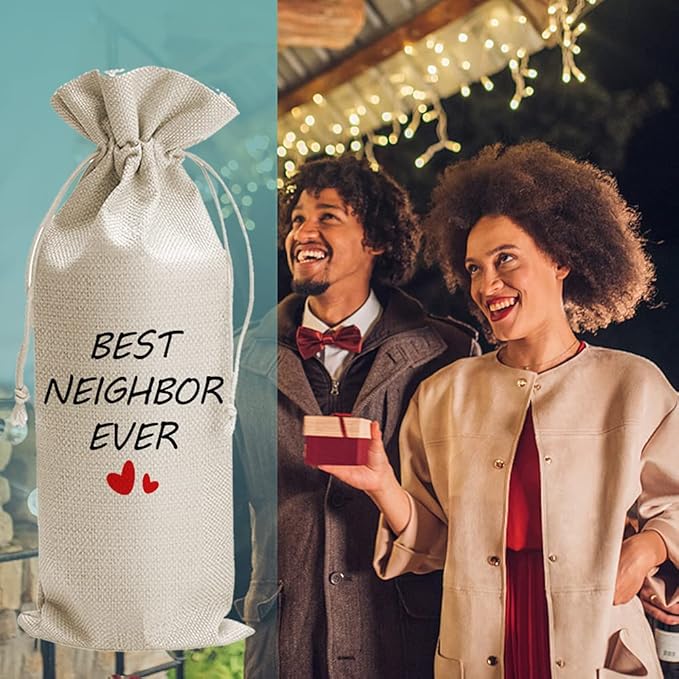 JioJio Chan Housewarming Gift Wine Bags, Housewarming Party Decorations, Burlap Drawstring Wine Bag, Funny Personalized Gift Ideas, New Home Owner Gift, Best Neighbor Ever, for Neighbor