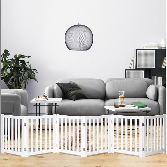 LZRS 6-Panel Extra-Wide Freestanding Wooden Dog Gate – 24”High Foldable Safety Pet Barrier for Doorways, Hallways, Kitchens, and Long Staircases, Durable Design fit Small to Medium Dogs, White