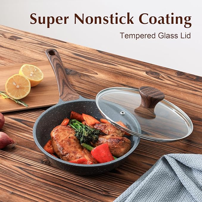 - Ergonomic Woodgrain Bakelite Handle - The handle of the 8inch nonstick cooking pan with lid features woodgrain design, it is comfortable to grip and stays cool while cooking. Oven safe up to 302°F.