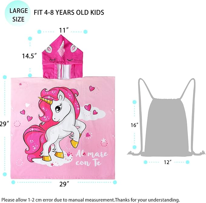 - SIZE: The kids hooded beach pool towel poncho measures 29.5"x29.5" in length with a 13.7x13.7" hood. This baby beach bath towels with hood is large enough for growing toddlers and kids(6-12 years old) or anyone under 60 inch girls boys.
