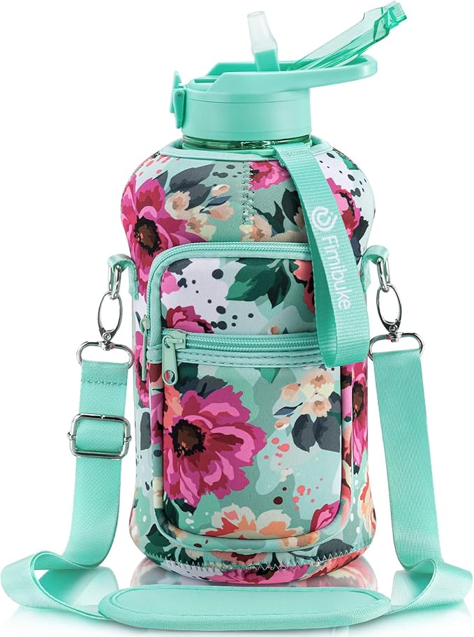 - INSULATED STORAGE SLEEVE: Our water bottle is designed with a high quality 5mm Neoprene sleeve, which not only can protect the water jug from slight bumps, but also keep water cold longer(water bottle is not insulated) and absorb messy sweat to avoid dripping on the table or seat. 2 zipper pocket is designed for storing your phone, card, airpods, etc. Comes with a adjustable & removable padded shoulder strap that can be adjusted from 25" to 50" to offer you more carrying options and hands free.