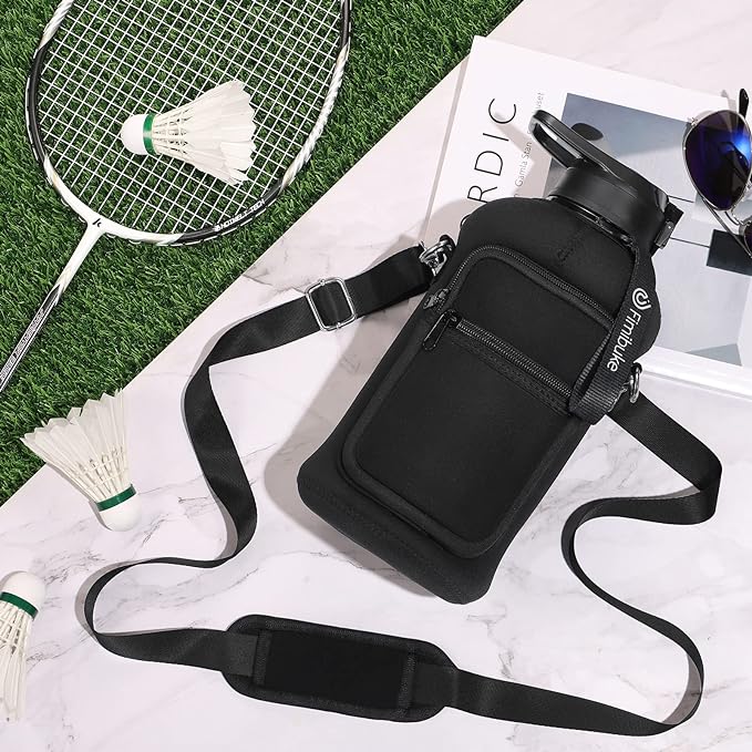 - INSULATED STORAGE SLEEVE: Our water bottle is designed with a high quality 5mm Neoprene sleeve, which not only can protect the water jug from slight bumps, but also keep water cold longer(water bottle is not insulated) and absorb messy sweat to avoid dripping on the table or seat. 2 zipper pocket is designed for storing your phone, card, airpods, etc. Comes with a adjustable & removable padded shoulder strap that can be adjusted from 25" to 50" to offer you more carrying options and hands free.