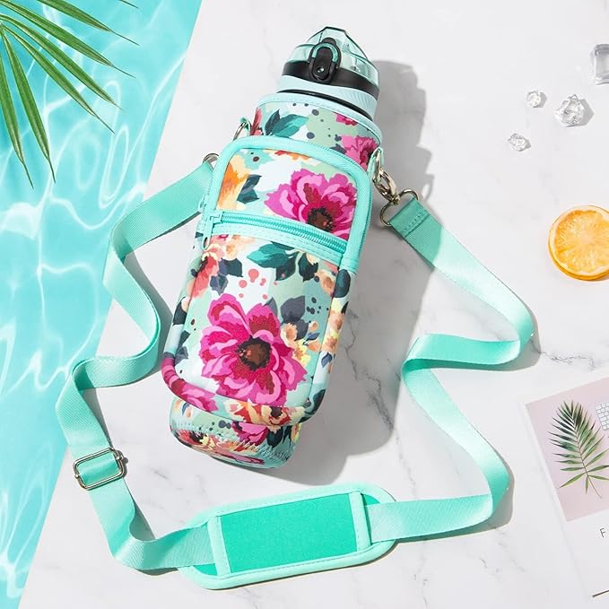 - PORTABLE STORAGE SLEEVE: 32oz water bottle is designed with high quality 5mm Neoprene sleeve, which not only can protect the water jug from slight bumps and scratch, but also keep water cold 2-3 hours(water bottle is not insulated) and avoid condensation. 2 zipper pockets are designed for carrying your phone, cards, airpods, keys etc. Comes with an adjustable & removable padded shoulder strap, which can be adjusted from 25" to 50", offers, women, men more carrying options and hands free.