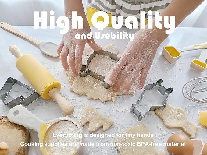 35-Piece Kids Baking Set with Teddy Bear Apron, Kid Friendly Knives, Cookie Cutters, Rolling Pin, Cutting Board, Whisk, Real Silicone Kitchen Accessories for Cooking and More