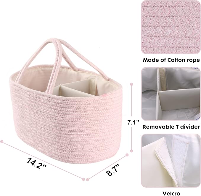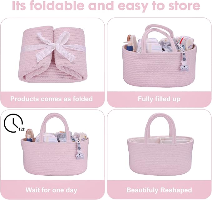 Baby Diaper Caddy Organizer for Girl Boy Rope Nursery Storage Bin Basket Portable Holder Tote Bag for Changing Table Car Travel Baby Shower Gifts Newborn Essentials Registry Must Have Items Pink