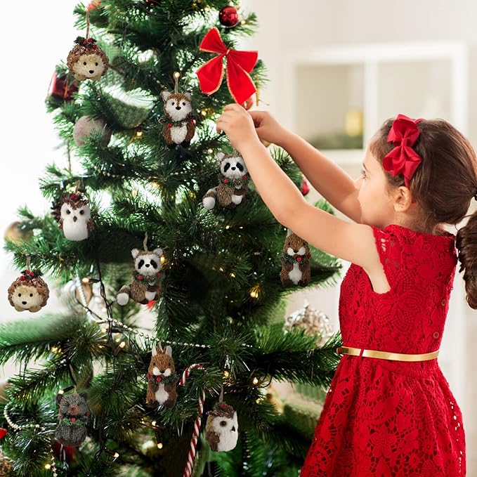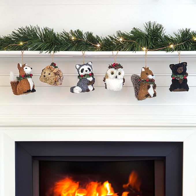 naturevibe Sisal Woodland Animals Christmas Tree Ornaments,Set of 6 Natural Forest Friends with Gift Boxes for Presents,Ornaments Animals as Rustic Home Decorations