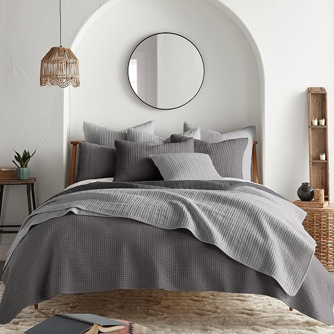- Timeless Waffle Texture. This quilt king size bedding set features a classic waffle weave on the front for a tactile, textural look, backed with a smooth coordinating cotton fabric. Designed to bring tactile dimension and understated elegance to your space—ideal for contemporary, coastal, or minimalist bedrooms.