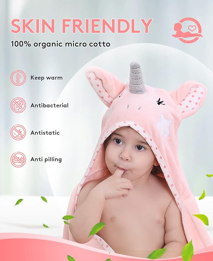 Hooded Towel for Kids 100% Cotton Ultra Soft with Unique Animal Design Large for Infants 3-10 Years (Unicorn)