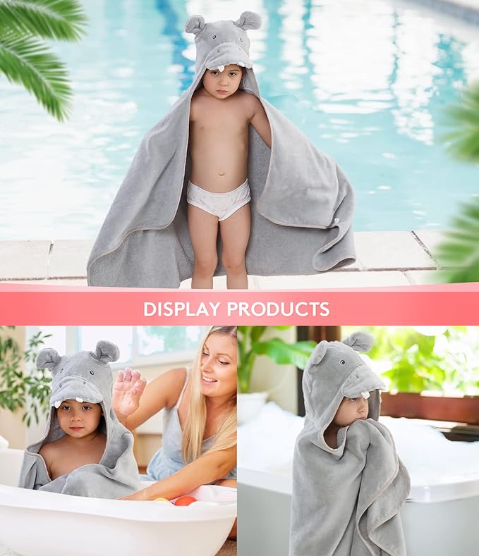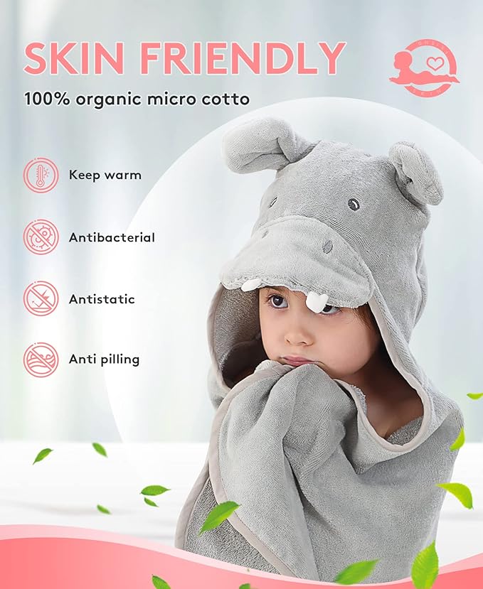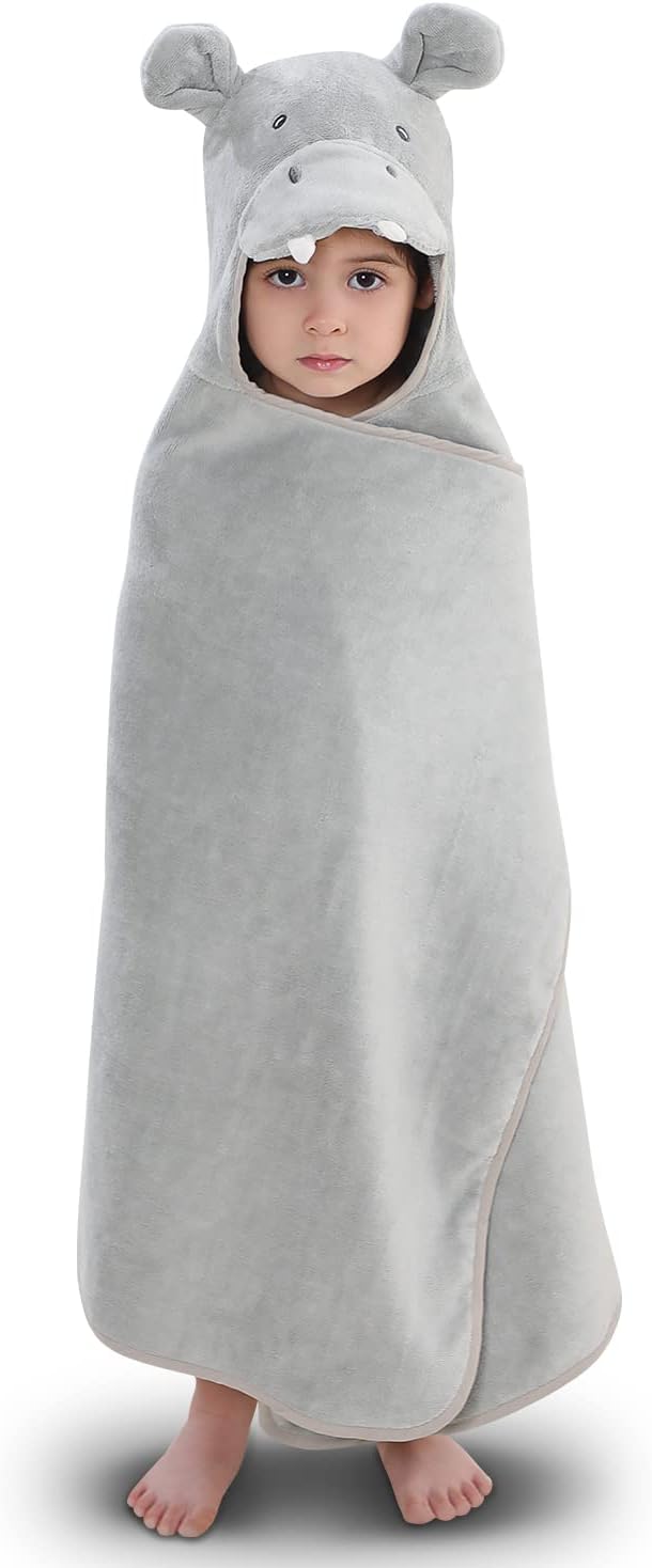 Hooded Towel for Kids 100% Cotton Ultra Soft with Unique Animal Design Large for Infants 3-10 Years (Hippo)
