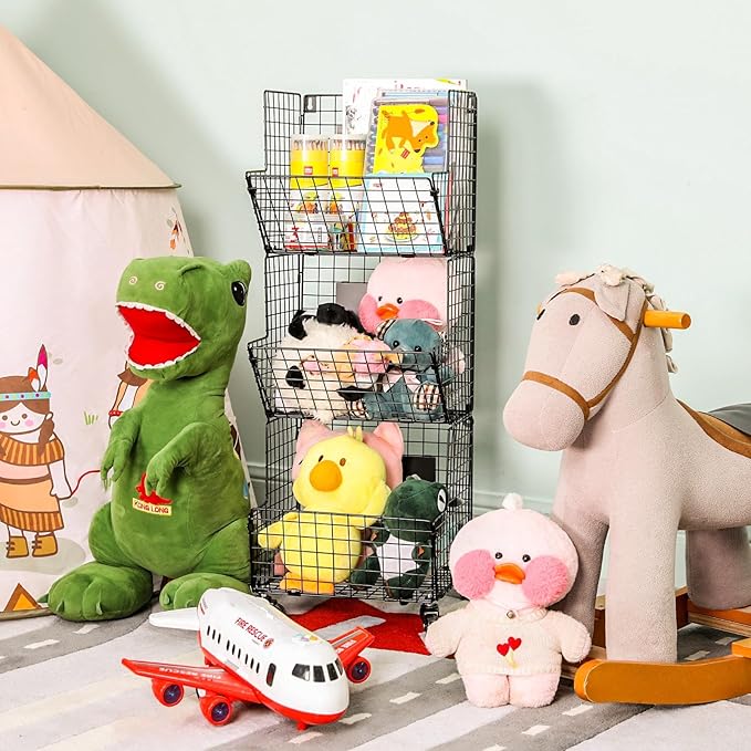 • STURDY & DURABLE CONSTRUCTION - Made of sturdy metal, 3-tiered setup can hold 50+ pounds of weight. Thicken the powder coated, strong rustproof, not rust as quickly as general metal wire basket. Slanted panels and Open basket design to maximize airflow, keep your kids' items dry and prevent moisture.