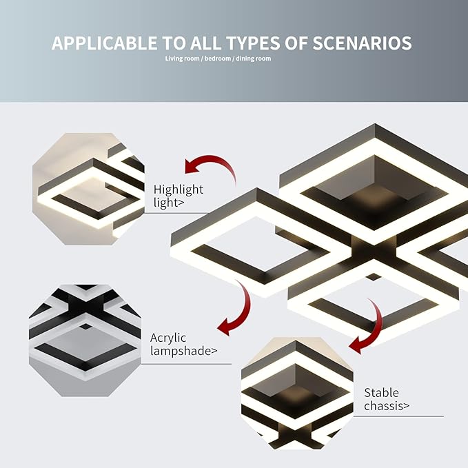- Modern Square Design: Designed in brushed square frame, this black ceiling light fixture is a type of creative and stereoscopic ceiling lighting fixture. Perfect for general indoor areas such as bedroom, living room, dining room, office, kitchen etc.