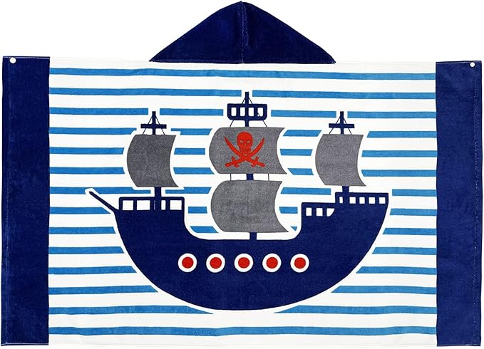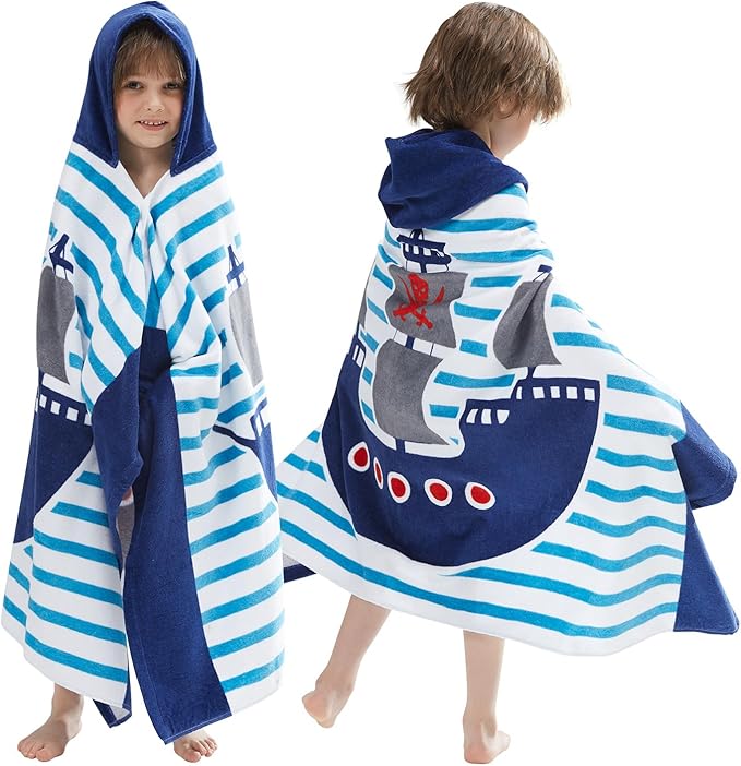 BANGSAUR Kids Hooded Beach Bath Towels, 100% Cotton 50"x30" Wrap Blanket, Toddlers Boys 3-12 Years Coverup Towel Pirate Ship