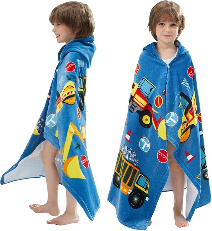 BANGSAUR Excavator Beach Towel, 100% Cotton 50"x30" Hooded Bath Wrap Towel, Toddlers Baby Boys 3-10 Years Coverup Truck