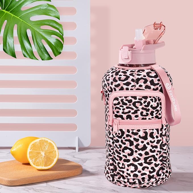 Fimibuke Half Gallon Water Bottle with Sleeve 64 OZ Water Bottle with Handle & Straw Leakproof Motivational Sports Gym Water Bottle with Time Marker BPA Free Water Jug with Reusable Neoprene Holder
