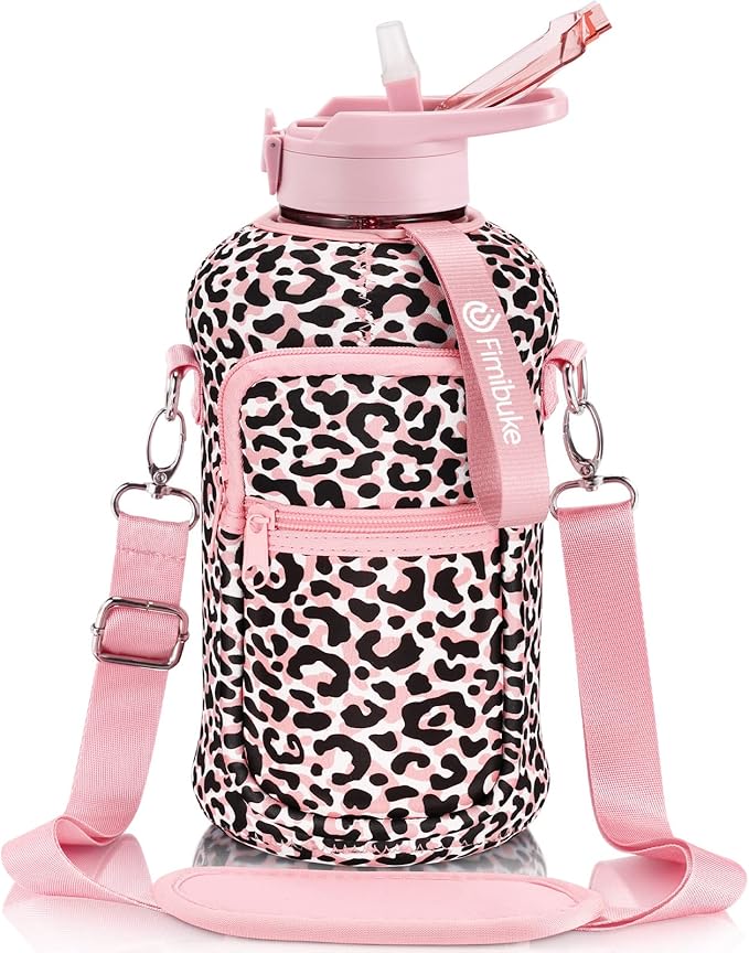 - INSULATED STORAGE SLEEVE: Our water bottle is designed with a high quality 5mm Neoprene sleeve, which not only can protect the water jug from slight bumps, but also keep water cold longer(water bottle is not insulated) and absorb messy sweat to avoid dripping on the table or seat. 2 zipper pocket is designed for storing your phone, card, airpods, etc. Comes with a adjustable & removable padded shoulder strap that can be adjusted from 25" to 50" to offer you more carrying options and hands free.