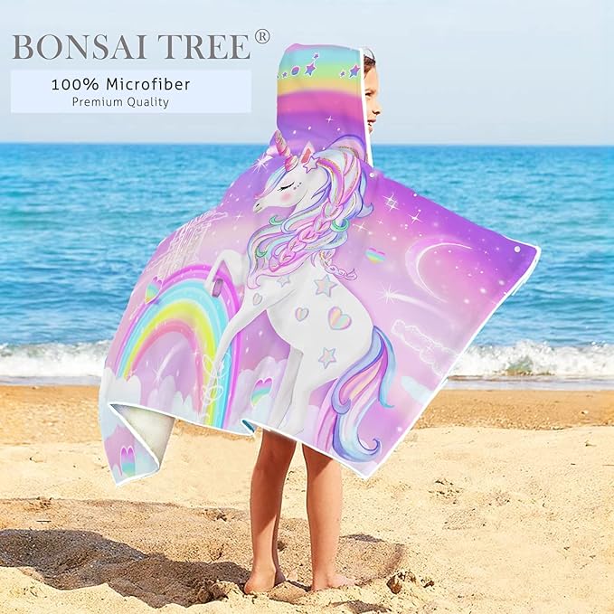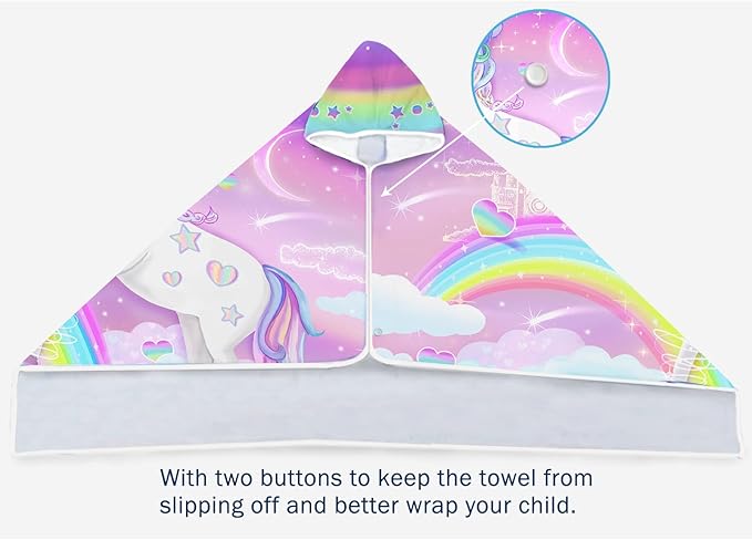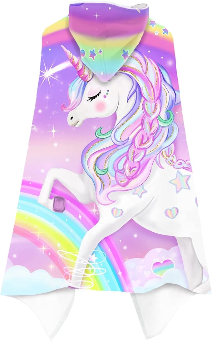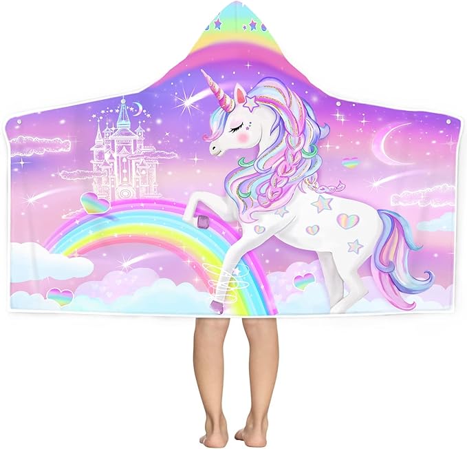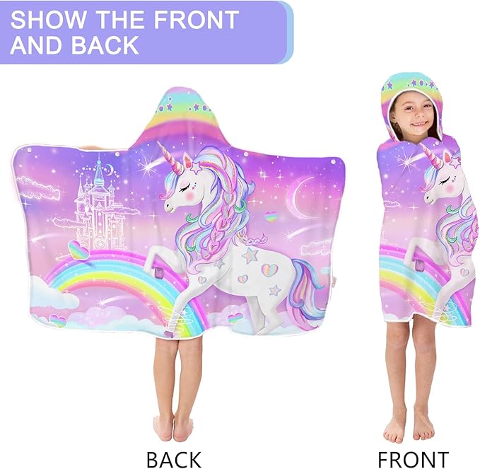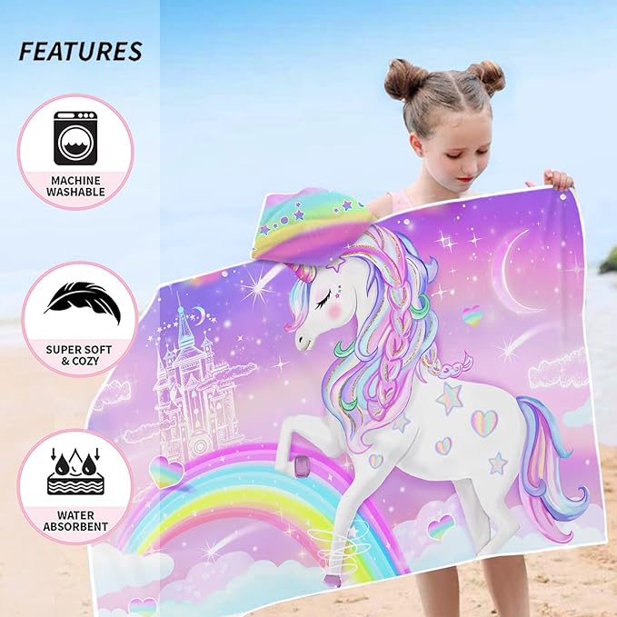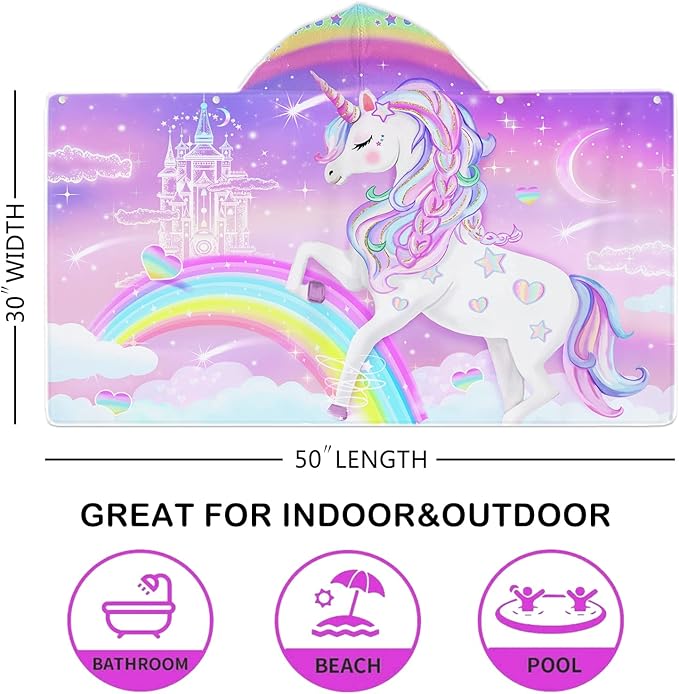 - [Multifunctional]: Our unicorn towels with hood for kids and little girls can be used at home for bath-time fun, and the unicorn hooded towel can also be used in the beach or swimming pool, protecting your children from catching cold after long water playing, drying quickly and keeping warm with comfortable experience