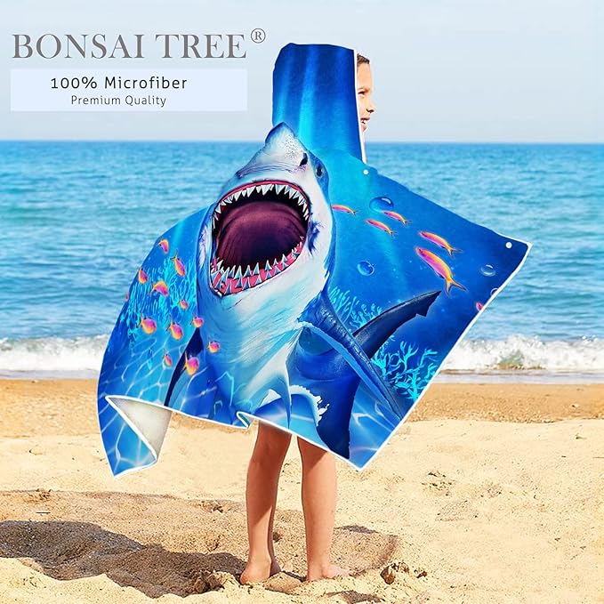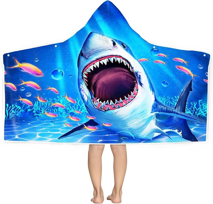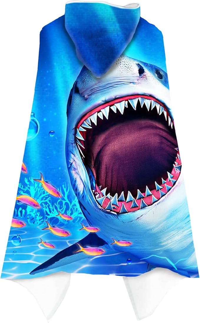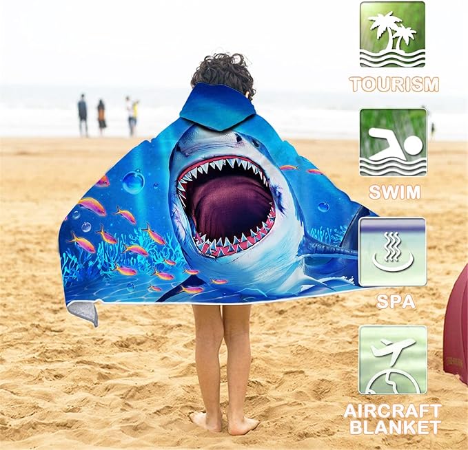 - [UNIQUE ADVANTAGES]: It is not the same as cotton, but it's smoother and stronger than cotton or terry cloth quality. Fast Quick drying - 3 times faster than cotton. The shark hooded beach towel can absorb up to 7 times its weight