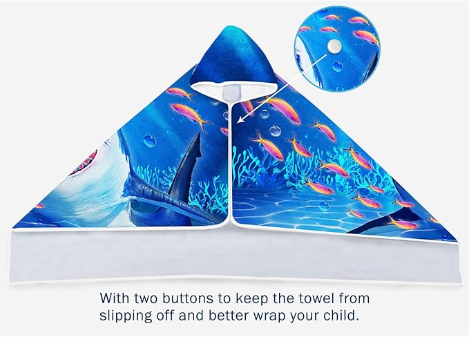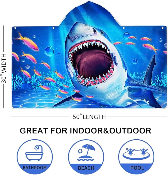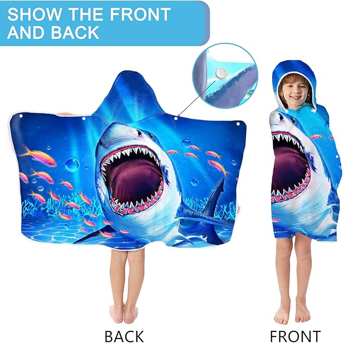 - [Multifunctional]: Our shark towels with hood for kids and boys can be used at home for bath-time fun, and the shark hooded towel can also be used in the beach or swimming pool, protecting your children from catching cold after long water playing, drying quickly and keeping warm with comfortable experience
