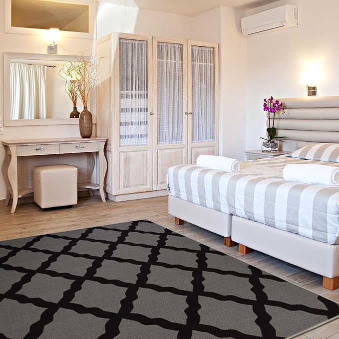 - [TRENDY STYLE]: This Colorful Moroccan Trellis Design Area Rug features a tasteful moroccan trellis design with black motifs on a dark gray background while also adding color and enhancing the look of your home. Its timeless design can be integrated into a variety of home décor styles.