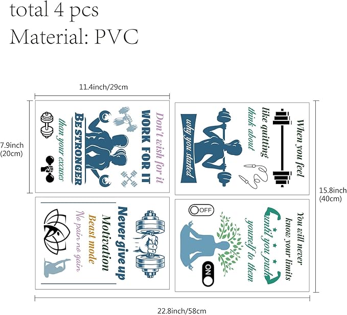 CREATCABIN 4pcs Gym Vinyl Wall Decals Weightlifting Exercise Inspirational Quotes Wall Stickers Self-Adhesive Peel and Stick Mural Decoration for Gym Yoga Studio Exercise Fitness Window Door Playroom